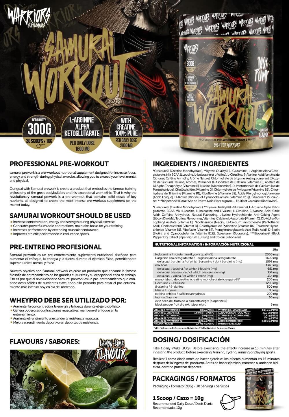 Este suplemento pre-entrenamiento de nivel profesional ha sido diseñado meticulosamente para aumentar el enfoque, amplificar la energía y potenciar la fuerza durante la actividad física intensa, permitiéndote superar tus límites físicos y mentales. Inspirado en las legendarias filosofías de entrenamiento y la ética de trabajo inigualable de los grandes culturistas, Samurai Pre-Workout fue creado para encarnar su dedicación implacable. Con dosis sólidas de nutrientes clave, esta fórmula revolucionaria ofrece la experiencia de pre-entrenamiento definitiva, estableciendo un nuevo estándar en intensidad y rendimiento.